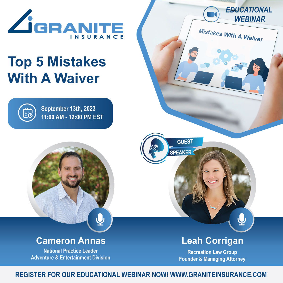 Hear from Granite Insurance’s National Practice Leader, Cameron Annas, and Recreation Law Group’s Founder & Managing Attorney, Leah Corrigan, as they bring their wealth of experience in the industry to spotlight the common pitfalls operations encounter when dealing with waivers. Whether you’re a seasoned entrepreneur or just starting, this webinar offers valuable insights that will help protect your venture from legal challenges and enhance your overall risk management strategy.